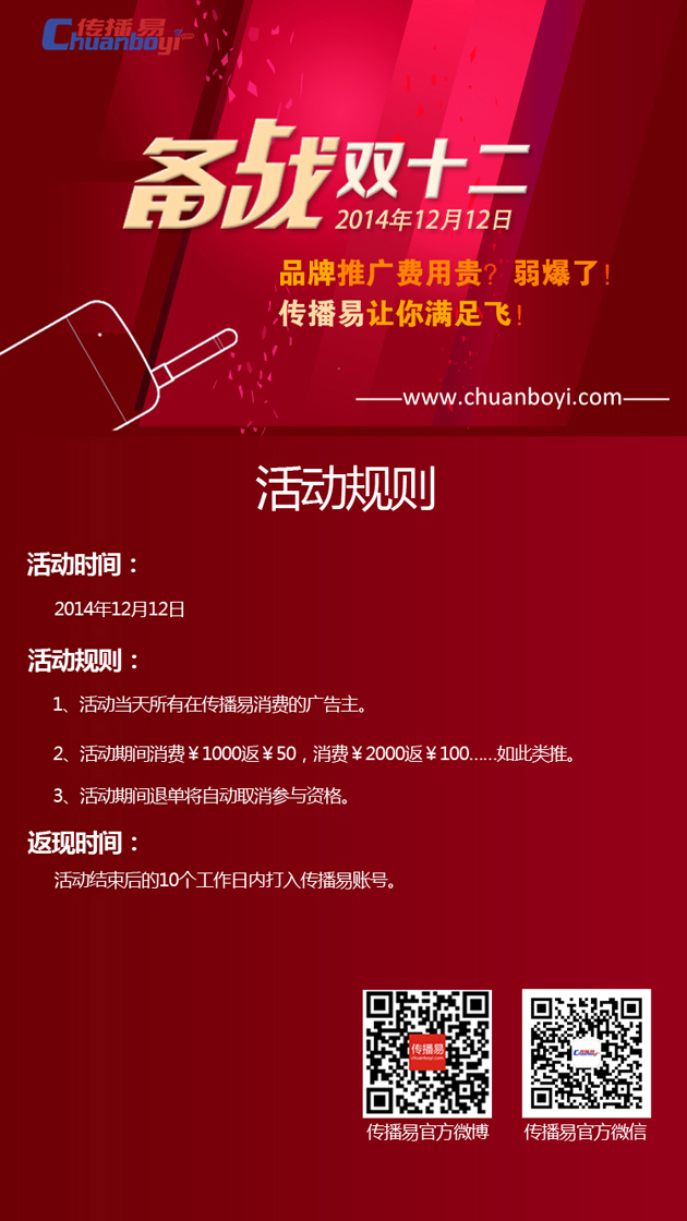 品牌推广费用贵?弱爆了!传播易让你满足让你飞!12月12日传播易活动促销,当天广告主在传播易商城消费满¥1000立返¥50,消费¥2000立返¥100……如此类推,消费越多返现越多,传播易商城只把广告价格做到最低,让利于您。