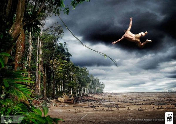 NO17.WWF 组织环保广告,人猿泰山要摔大跟头了,广告语:热带雨林正在以每分钟15平方公里的速度消失