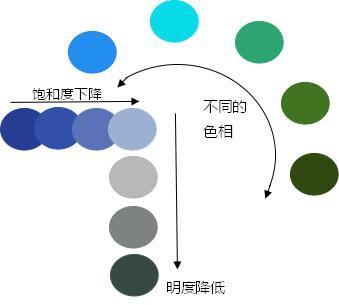 色相就是大家所说的红色、绿色等色彩;饱和度是指颜色的纯度;明度标识颜色的明暗程度。三者关系如下图所示: